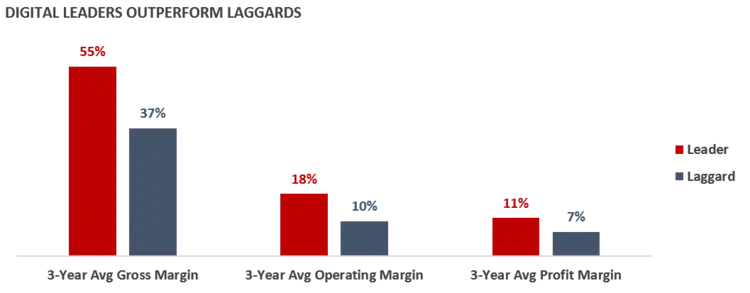 These results were later corroborated by Bock et al. in the 2017 study, “What the Companies on the Right Side of the Digital Business Divide Have in Common.”[3] The authors created a “digitization index” that separated businesses into quartiles based on how well they had digitized: Digital Leaders represent the companies in the top quartile and Laggards represent the companies in the bottom quartile. Digital Leaders outperform Digital Laggards across three important measures: gross margin, operating margin, and profit margin.