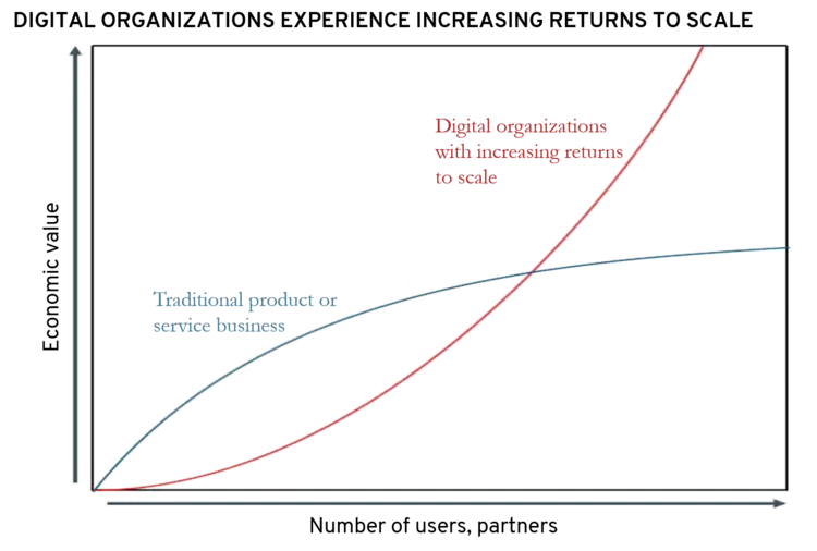 Broadly, digitization is the improvement of a company’s business models, procedures, and operations through the adoption of digital technologies. These improvements allow companies to exploit increasing returns to scale and grow more sustainably and more quickly than traditional companies.[1] Harvard Business School’s Karim Lakhani and his colleagues at Keystone Strategy constructed the chart below that illustrates this relationship.